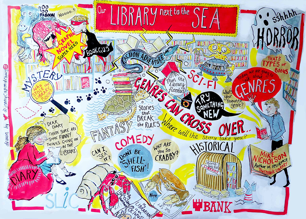 Graphic recording by Jenny Capon of Mike’s TowerbankPS residency session on Same Title – Different Genre